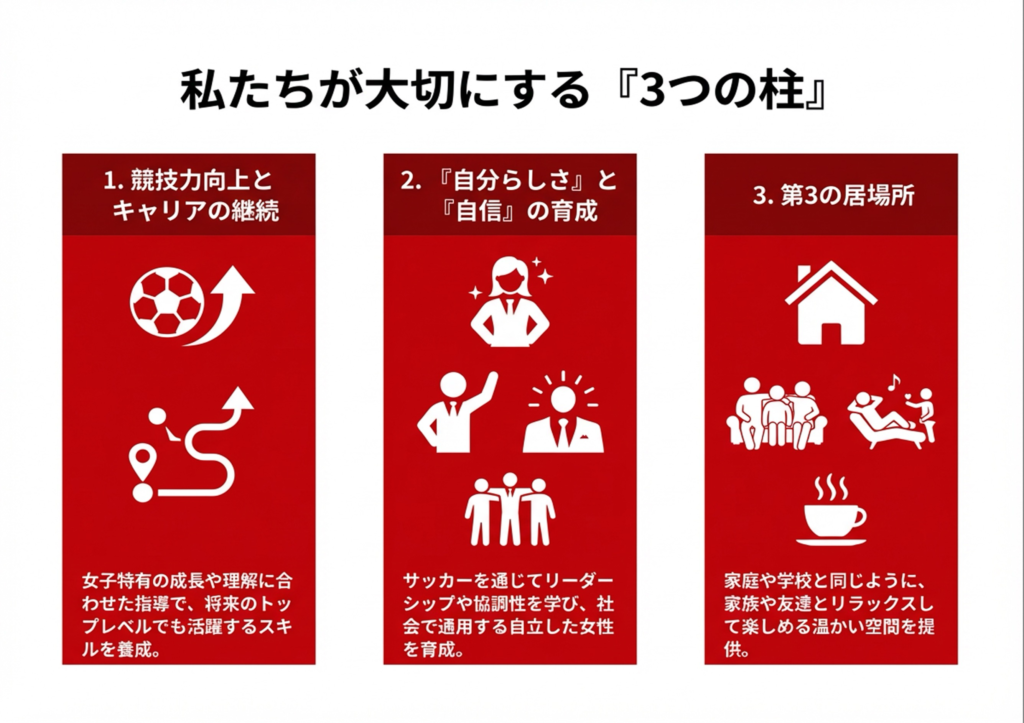 私たちが提供するのは、単なる「練習場」ではありません。女子選手が周囲の目を気にすることなく、自分たちの力を100%発揮し、「常にピッチの主役」として主導権を握れる場所です 。